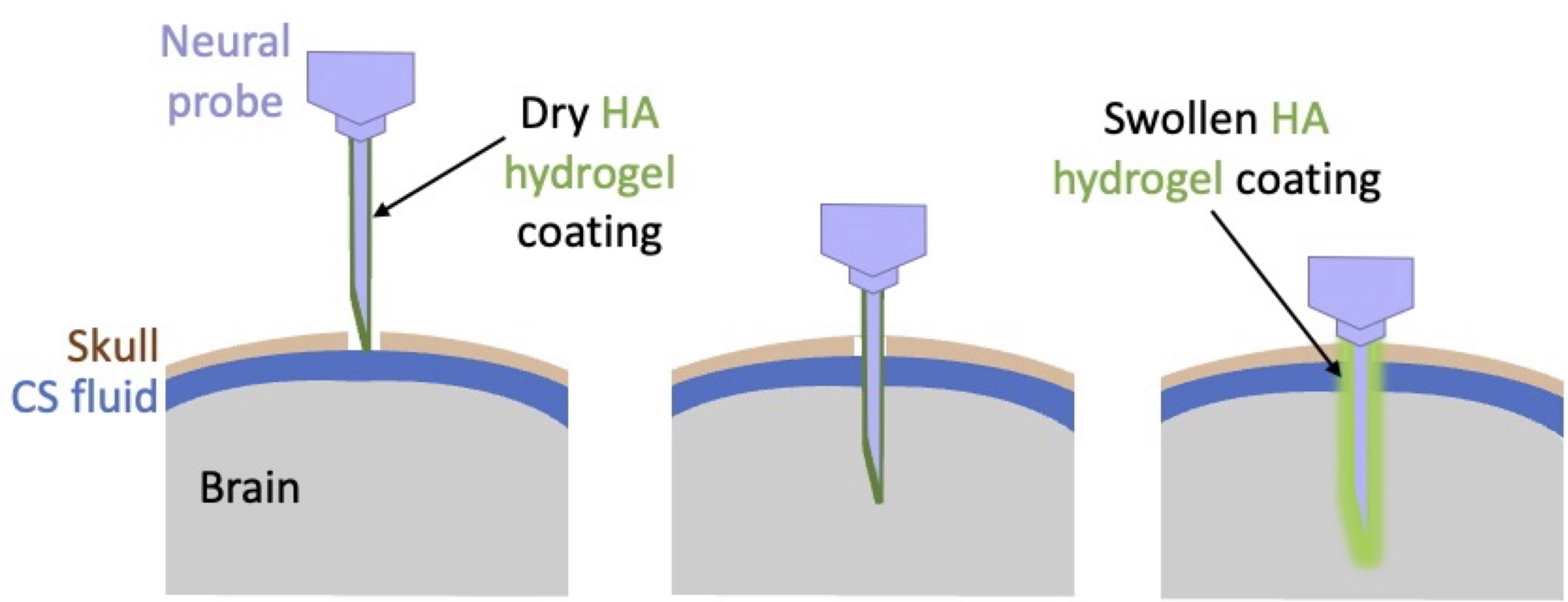 Penetrating neural probes have demonstrated great potential in human brain-machine interface applications. However, the success of this technology is limited by challenges in maintaining a stable, long-term interface for reliable recording and stimulation, due to an inflammatory response called foreign body reaction. To reduce this reaction, research has focused on the use of flexible probes, that better match the mechanical properties of surrounding neural tissue, thereby reducing device rejection. The fabrication of these compliant devices typically involves either the use of soft polymeric materials as substrates, such as parylene, polyimide, polydimethylsiloxane, and/or the use of significantly thinner stiff materials. However, increasing flexibility renders the devices more fragile and thus complicates the insertion procedure. The implantation of soft electrodes can be facilitated by coating the electrode with a stiff, water-soluble polymer that dissolves once in the brain, by using electrode shuttles, or other auxiliary tools. Another approach involves building the electrodes on a mechanically adaptive substrate that can undergo a stiff-to-soft transition when placed in physiological conditions. In this context, we recently developed a strategy based on a hyaluronic acid (HA) hydrogel coating applied to the probe surface (Figure 1). The role of the HA hydrogel coating is to act (i) as a stiffening material in the dry state for insertion of the probe in the brain and, (ii) as a soft biomimetic coating after re-swelling following implantation allowing to minimize inflammatory host tissue response. As hyaluronic acid is a major constituent of brain extracellular matrix, this soft coating represents a promising approach to enhance implant integration. However, hydrogels applied as coating layers are expected to be particularly prone to mechanical stresses and deformations during the re-swelling process following implantation due to the significant mechanical constraints arising from their immobilization on the devices’ surface. This internship project thus aims to investigate the behavior of the HA hydrogel hybrid probe after its insertion into an agarose-based phantom mimicking brain tissue, using X-ray computed tomography (CT) imaging. To this end, the first step will consist in labeling the hydrogel with an iodine contrast agent to achieve sufficient X-ray signal without significantly affecting the physico-chemical properties of the HA network. This will involve chemical modification of polymers, followed by the synthesis and characterization of the hydrogels in both bulk form and as thin coating films, with regard to their mechanical behavior and swelling properties. The second step will focus on real time visualization of radiopaque hydrogel coating re-swelling using X-ray CT. This will require detailed image analysis to correlate the re-swelling kinetics and probe shape as a function of its preparation conditions.
